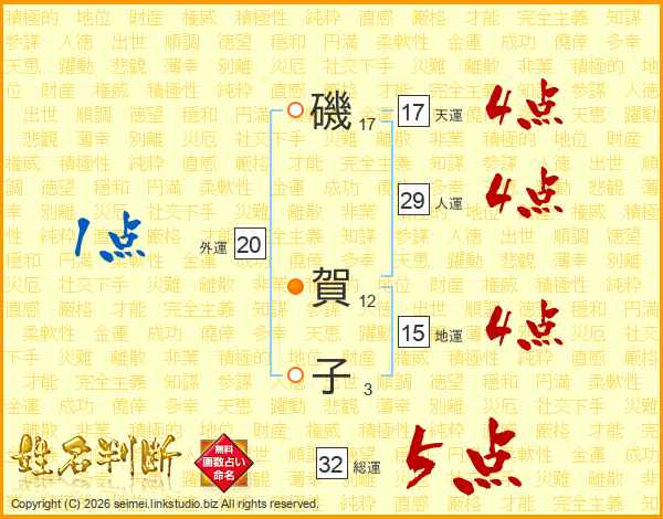 生活面を象徴する運勢です。外部から受ける影響力を表し、結婚運、家庭運や職場、環境への順応性を表します。総運から人運を引いた画数。姓や名が1文字の場合を除く。