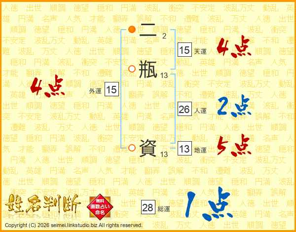 二瓶資さんの人運は26画の2点!