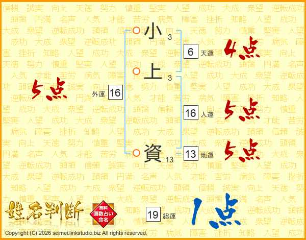 生活面を象徴する運勢です。外部から受ける影響力を表し、結婚運、家庭運や職場、環境への順応性を表します。総運から人運を引いた画数。姓や名が1文字の場合を除く。