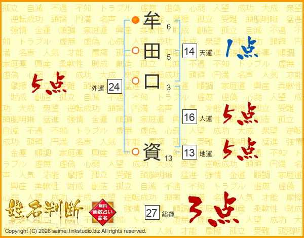 牟(6画)田(5画)口(3画) 資(13画)