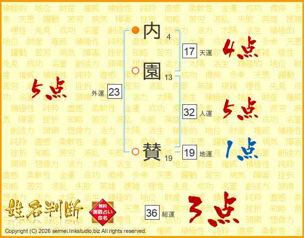 生活面を象徴する運勢です。外部から受ける影響力を表し、結婚運、家庭運や職場、環境への順応性を表します。総運から人運を引いた画数。姓や名が1文字の場合を除く。