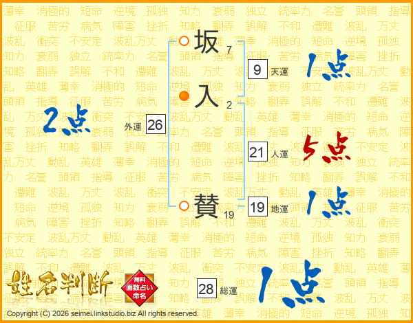 生活面を象徴する運勢です。外部から受ける影響力を表し、結婚運、家庭運や職場、環境への順応性を表します。総運から人運を引いた画数。姓や名が1文字の場合を除く。