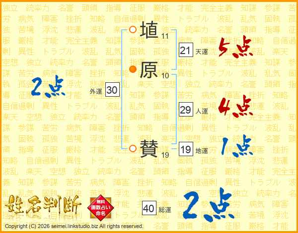 生活面を象徴する運勢です。外部から受ける影響力を表し、結婚運、家庭運や職場、環境への順応性を表します。総運から人運を引いた画数。姓や名が1文字の場合を除く。