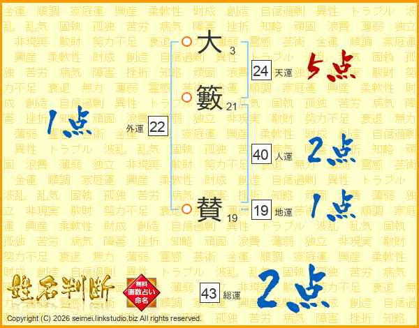 大籔賛さんの総運は43画の2点!