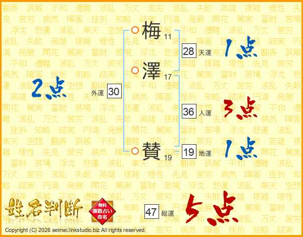 生活面を象徴する運勢です。外部から受ける影響力を表し、結婚運、家庭運や職場、環境への順応性を表します。総運から人運を引いた画数。姓や名が1文字の場合を除く。