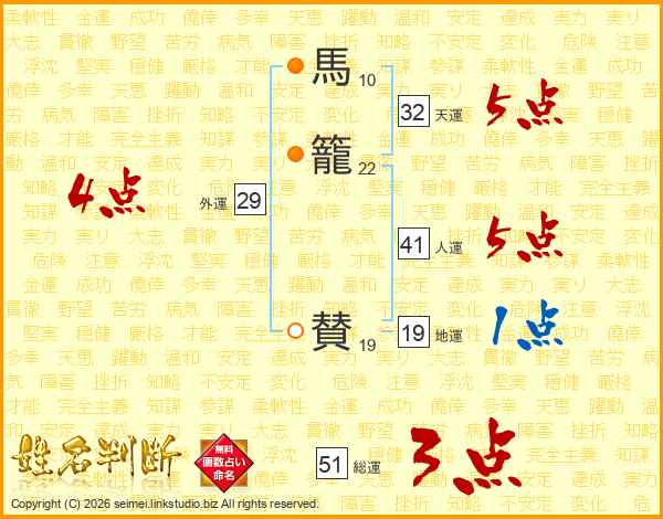 生活面を象徴する運勢です。外部から受ける影響力を表し、結婚運、家庭運や職場、環境への順応性を表します。総運から人運を引いた画数。姓や名が1文字の場合を除く。