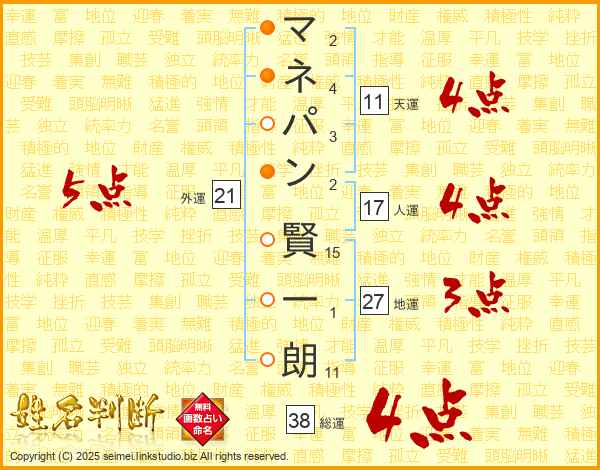 マ(2画)ネ(4画)パ(3画)ン(2画) 賢(15画)一(1画)朗(11画)
