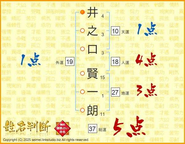 井(4画)之(3画)口(3画) 賢(15画)一(1画)朗(11画)