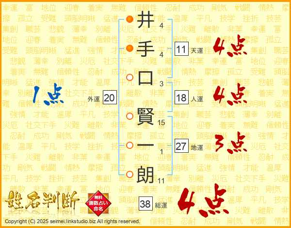 井(4画)手(4画)口(3画) 賢(15画)一(1画)朗(11画)