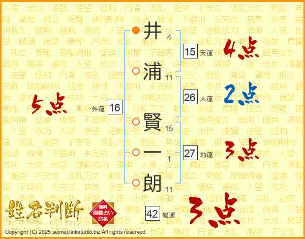 井(4画)浦(11画) 賢(15画)一(1画)朗(11画)