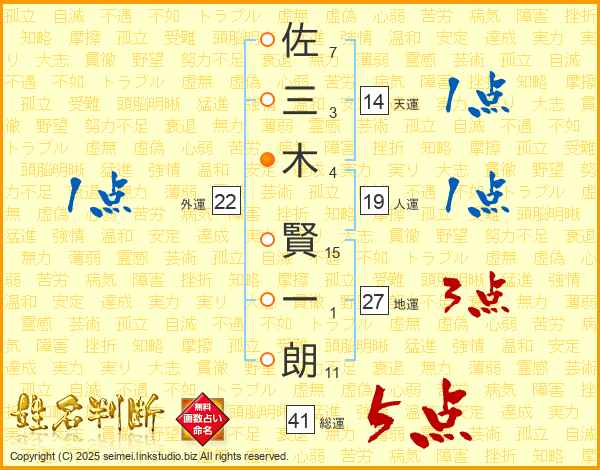 佐(7画)三(3画)木(4画) 賢(15画)一(1画)朗(11画)