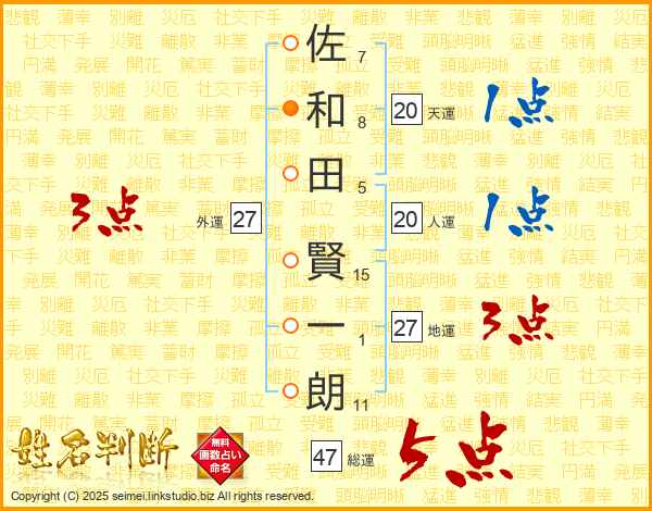 佐(7画)和(8画)田(5画) 賢(15画)一(1画)朗(11画)