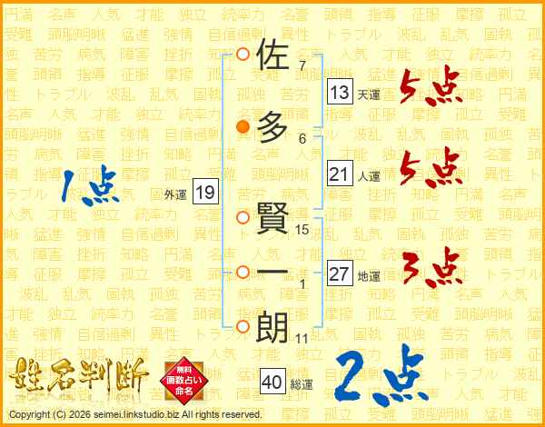 佐(7画)多(6画) 賢(15画)一(1画)朗(11画)