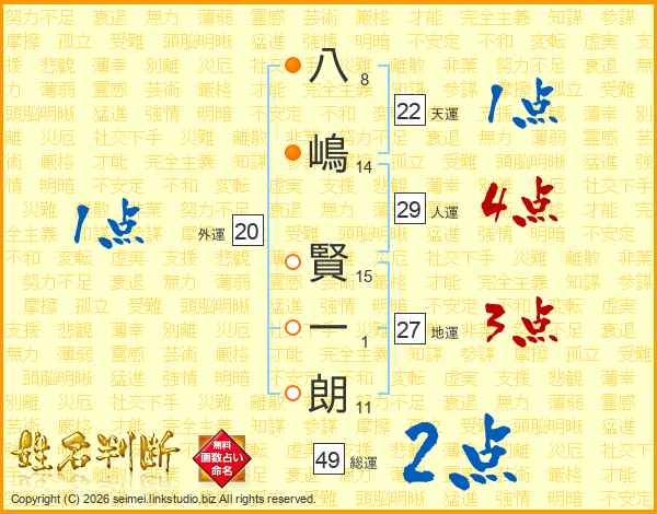 八(8画)嶋(14画) 賢(15画)一(1画)朗(11画)