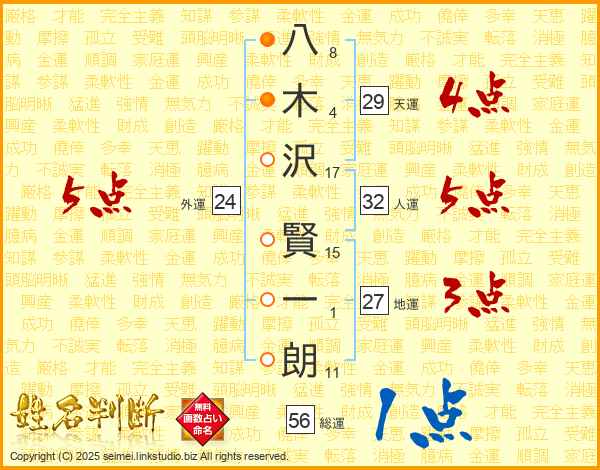 八(8画)木(4画)沢(17画) 賢(15画)一(1画)朗(11画)