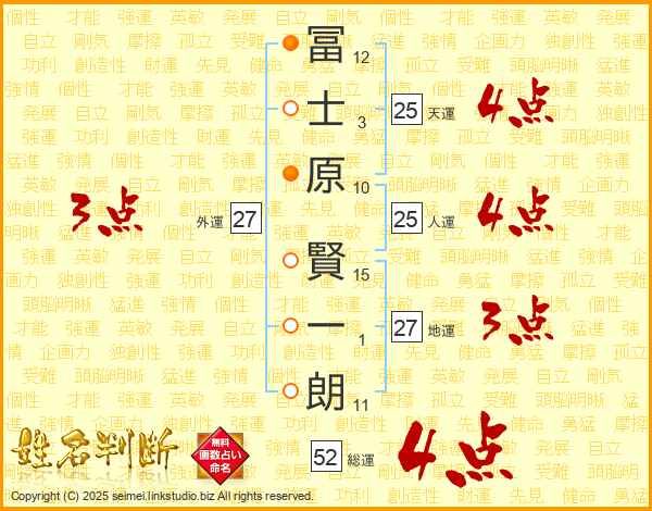 冨(12画)士(3画)原(10画) 賢(15画)一(1画)朗(11画)