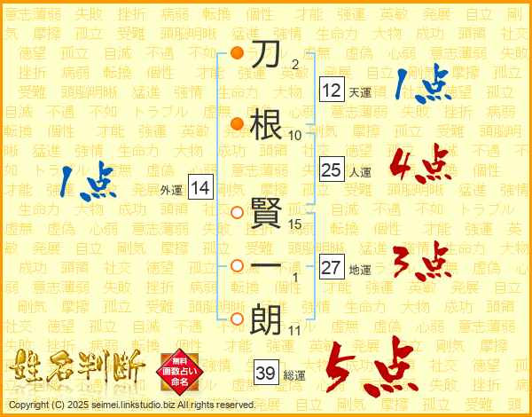 刀(2画)根(10画) 賢(15画)一(1画)朗(11画)