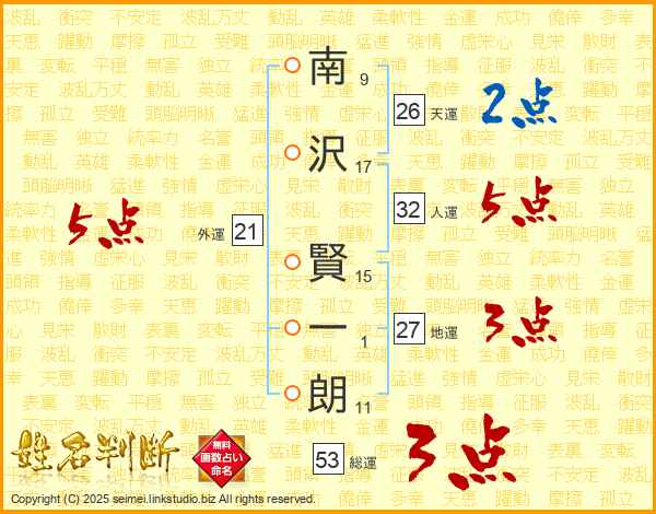 南(9画)沢(17画) 賢(15画)一(1画)朗(11画)