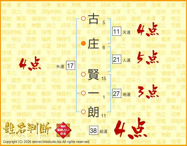 古(5画)庄(6画) 賢(15画)一(1画)朗(11画)