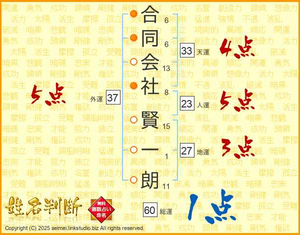 合(6画)同(6画)会(13画)社(8画) 賢(15画)一(1画)朗(11画)