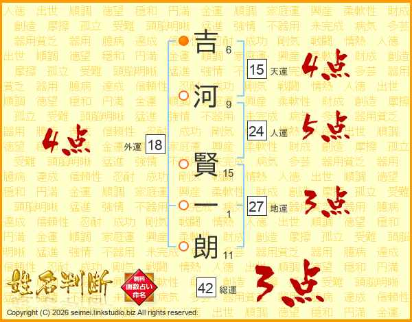 吉(6画)河(9画) 賢(15画)一(1画)朗(11画)