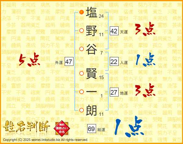 塩野谷賢一朗さんの天運は42画の3点!