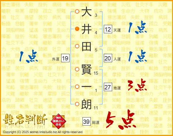 大(3画)井(4画)田(5画) 賢(15画)一(1画)朗(11画)