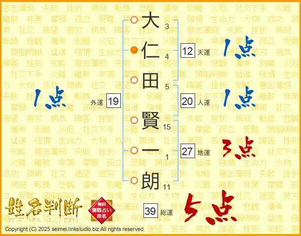大(3画)仁(4画)田(5画) 賢(15画)一(1画)朗(11画)