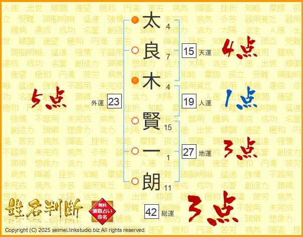 太(4画)良(7画)木(4画) 賢(15画)一(1画)朗(11画)