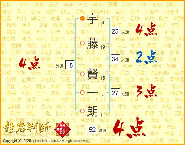 宇(6画)藤(19画) 賢(15画)一(1画)朗(11画)