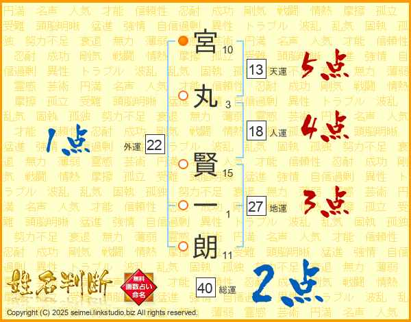 宮(10画)丸(3画) 賢(15画)一(1画)朗(11画)