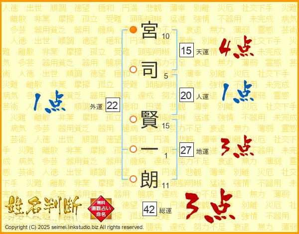 宮(10画)司(5画) 賢(15画)一(1画)朗(11画)