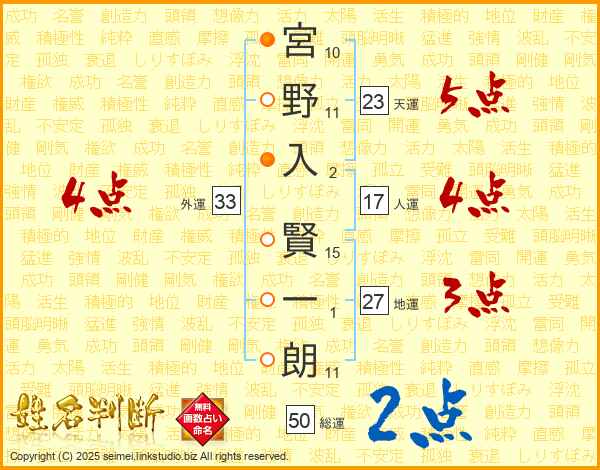宮野入賢一朗さんの外運は33画の4点!