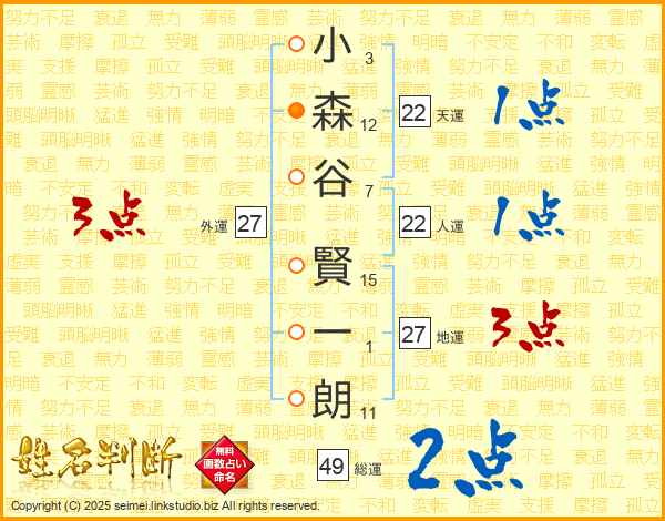 小(3画)森(12画)谷(7画) 賢(15画)一(1画)朗(11画)