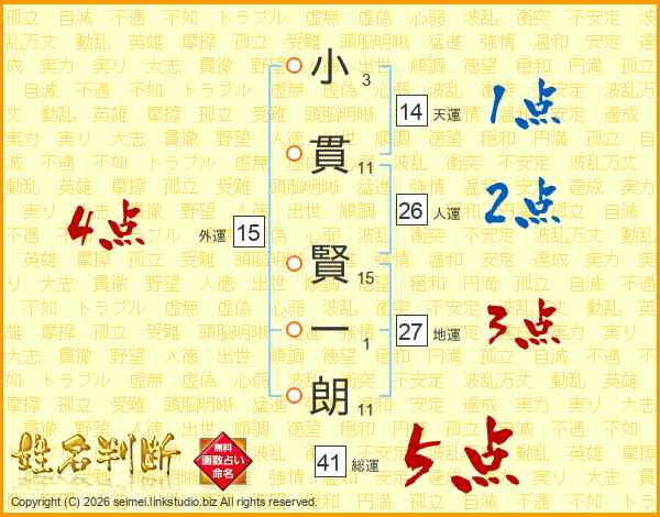 小(3画)貫(11画) 賢(15画)一(1画)朗(11画)
