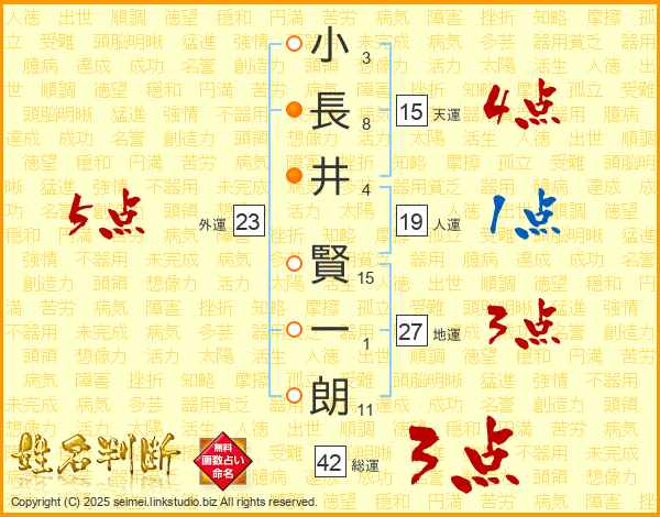 小(3画)長(8画)井(4画) 賢(15画)一(1画)朗(11画)