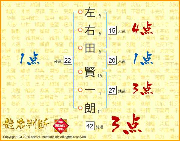 左(5画)右(5画)田(5画) 賢(15画)一(1画)朗(11画)