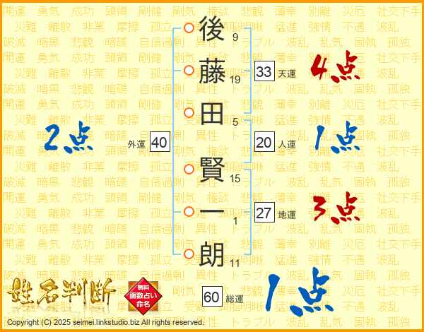 後(9画)藤(19画)田(5画) 賢(15画)一(1画)朗(11画)