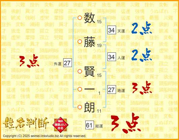 数(15画)藤(19画) 賢(15画)一(1画)朗(11画)
