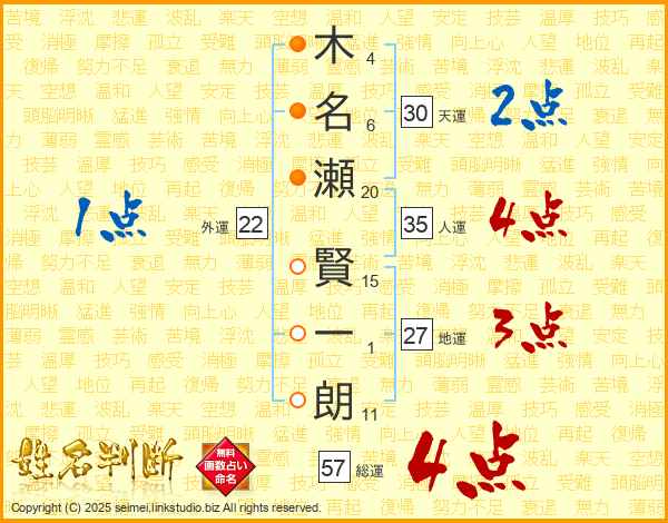 木(4画)名(6画)瀬(20画) 賢(15画)一(1画)朗(11画)