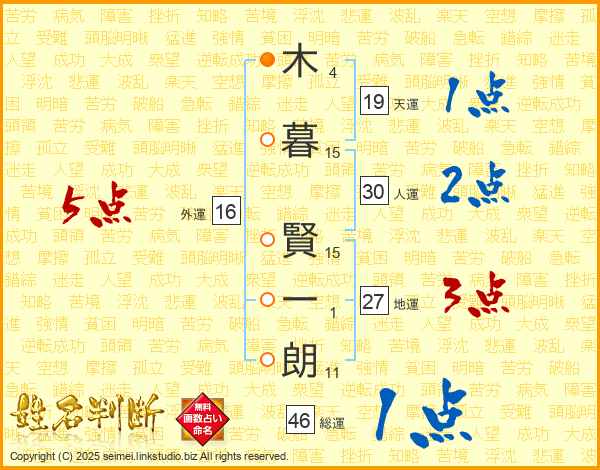 木(4画)暮(15画) 賢(15画)一(1画)朗(11画)