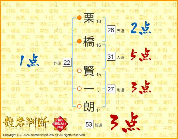 栗(10画)橋(16画) 賢(15画)一(1画)朗(11画)