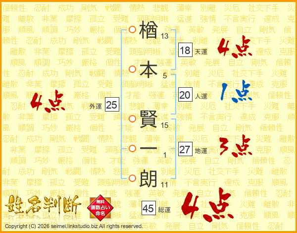 楢本賢一朗さんの総運は45画の4点!
