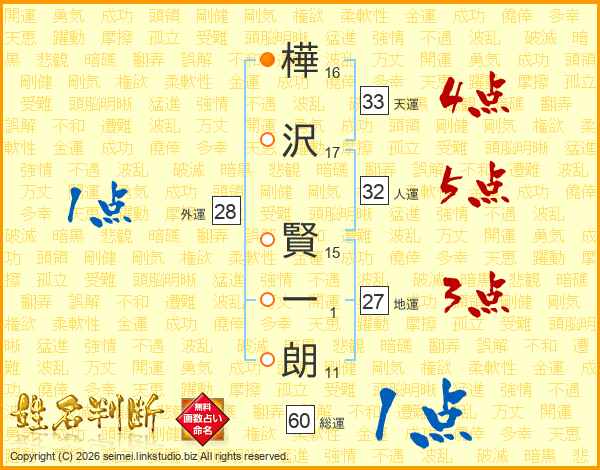 樺(16画)沢(17画) 賢(15画)一(1画)朗(11画)
