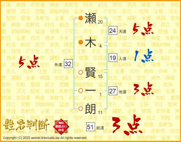 瀬(20画)木(4画) 賢(15画)一(1画)朗(11画)