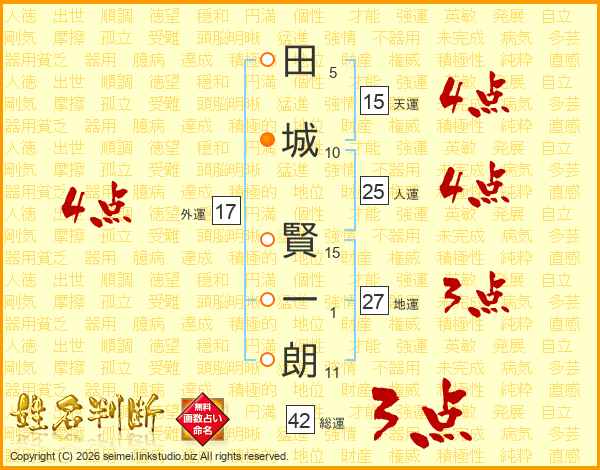 田(5画)城(10画) 賢(15画)一(1画)朗(11画)