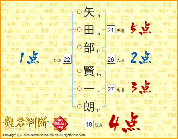 矢(5画)田(5画)部(11画) 賢(15画)一(1画)朗(11画)