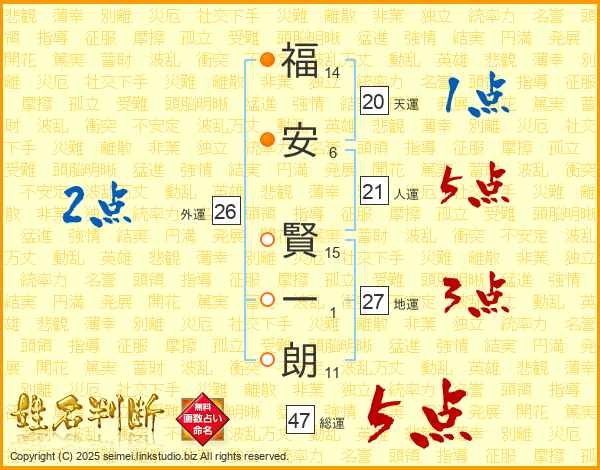 福(14画)安(6画) 賢(15画)一(1画)朗(11画)