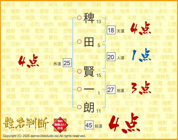 稗(13画)田(5画) 賢(15画)一(1画)朗(11画)
