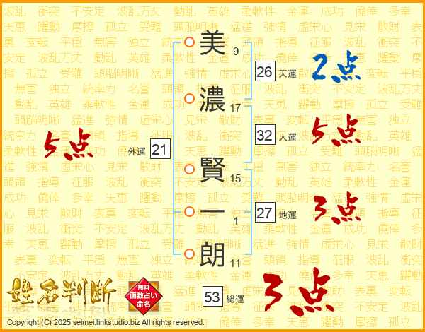 美(9画)濃(17画) 賢(15画)一(1画)朗(11画)
